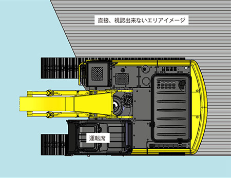 例えば、建設機械の代表、油圧ショベルでは、運転室が機械左前方に設置されているため、機械の後方と右側は、一般の車以上に見えにくい“死角”になっています。もちろんバックミラーはついていますが、周囲の安全確認には最善の注意が必要です。最近はミラーの代わりに、建機本体にCCDカメラを設置し、運転席内に設けられた液晶モニターで周囲を監視する装置を搭載する機種が増えてはいます。しかし、カメラ映像をそのまま表示するこれまでの周囲監視モニターシステムでは、使い勝手にいくつかの問題がありました。