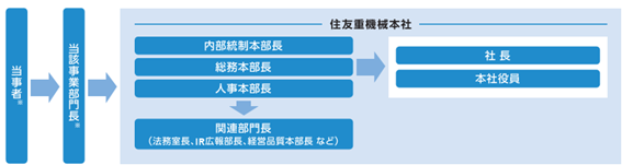 万一、当社グループ納入製品に起因する人身・火災事故などの重大な事故が発生した場合、経営トップへの速やかな連絡、正確な情報の把握、迅速かつ的確な対応を行うため、「住友重機械グループ緊急事態連絡要領」にて報告の手順、フローを定めています。