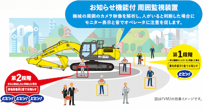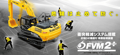 Overview of service or product | To ensure the safety of our customers, Sumitomo Construction Machinery felt it was necessary to reduce the lack of awareness of what is happening around machinery, which is considered to be one of the main reasons that accidents occur in which people are trapped or pulled into machinery. In addition to the "FVM" function that enables operators to check the rear view over a wide angle of 270° while sitting in the driver's seat of the excavator, we are further developing "FVM2" by fitting a peripheral monitoring device equipped with a notification function to the excavator. |