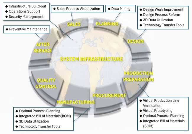 Overview of service or product | Nowadays there is greater demand for rapid management, and focus is placed on how quickly we can respond to changes in the market and the diversification of customer needs. Lightwell provides the following services consistently to resolve challenges in design and manufacturing operations, under the theme of "Convert technological information into strategy," by accumulating and utilizing the expertise it has amassed in the 40 years since its establishment. |
