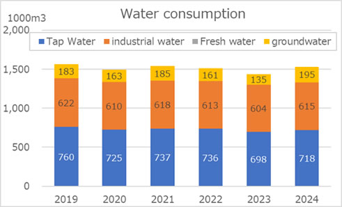 - We are working to reduce water intake (reducing water usage) or use water efficiently by checking for and improving leaks, reusing cooling water, and promoting the use of rainwater.
