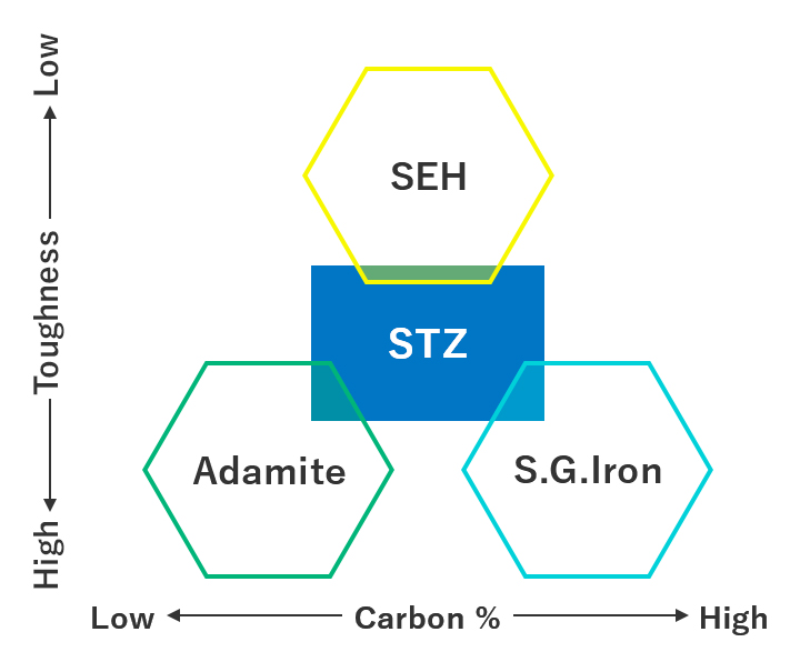 These are rolls that have properties that are in between the high speed tool steel materials and the conventional materials such as cast iron materials (ductile cast iron) and cast steel materials (adamite). These are rolls with material characteristics that appear to contradict each other, such as thermal crack resistance, toughness, wear resistance and surface roughness resistance, making it capable of responding to a variety of quality requirements as a raw material and through the entire process leading up to the finishing stand.