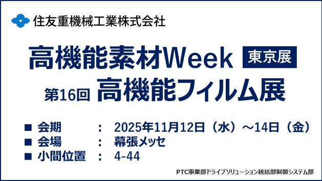 住友重機械工業株式会社PTC事業部ドライブソリューション統括部制御システム部は、「第16回 高機能フィルム展 - FILMTECH JAPAN -」に出展します。