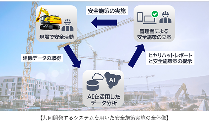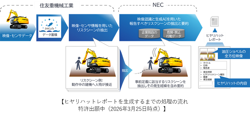 こうした背景を踏まえ、建設機械の知識とデータ分析技術を保有する住友重機械と、長年培ってきた映像認識技術と最新の生成AI技術を保有するNECの連携により、油圧ショベルに取り付けたカメラ映像やセンサ情報を基に、現場課題に即したヒヤリハットの抽出、レポート化を自動で行うシステムの開発を業界で初めて開始します。