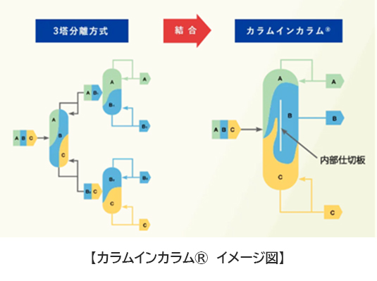 カラムインカラム®は省エネルギー性と省スペース性に優れており、化学産業においてCO2排出量が多いとされる蒸留プロセスにおいて、従来の連塔方式と比較して省エネルギーで稼働し、生産プロセス中のCO2排出量も抑制する次世代型蒸留塔です。