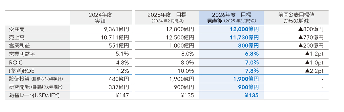 また、「収益力の改善」「資本効率の向上」「新事業探索の強化」の3つの重点課題を実現するため、コーポレート、セグメントの両面から戦略を遂行し、2026年度において、受注高12,000億円、売上高11,730億円、営業利益800億円、ROIC7.0%以上を目指します。なお、現状の事業環境および財務状況を考慮し2025年2月に目標を見直しています。詳しくは「業績予想と投資計画」をご参照ください。