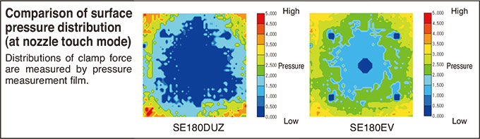 With earlier machines, more than the necessary clamp force was needed to balance the surface pressure applied to the mold. The SE-EV Series incorporates a new feature that balances this surface pressure even at low clamp force.