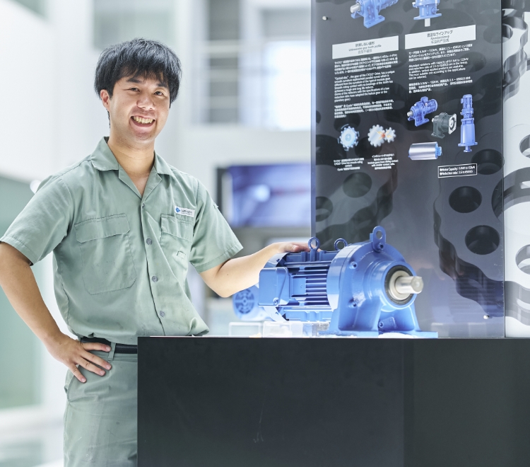 その中でも私は現在、磁石モータの開発にメンバーの一員として取り組んでいます。工場で多く使用される一般的な誘導機と比べて、効率が高く小型化できることが磁石モータの特徴です。今回の磁石モータ開発では海外のグループ会社との協業で商品化したもので、私は、減速機と直結するための設計をはじめ、販売資料の作成、海外で販売するための認証取得などに携わりました。欧州の開発拠点や東南アジアの製造拠点など、世界各国の担当者と日々連携しながら仕事を進めています。